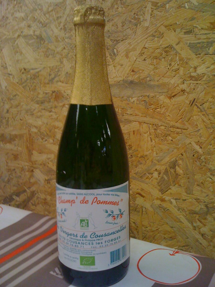Pétillant de pomme AB sans alcool, contrôlé par Ecocert, produit dans la Meuse. Bouteille de 75 cl