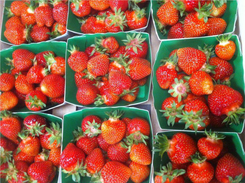 Fraises bio cultivées par nos soins. Variété Rubis des jardins ou Charlotte ou Darselect. Vendues en barquette de 250 g.